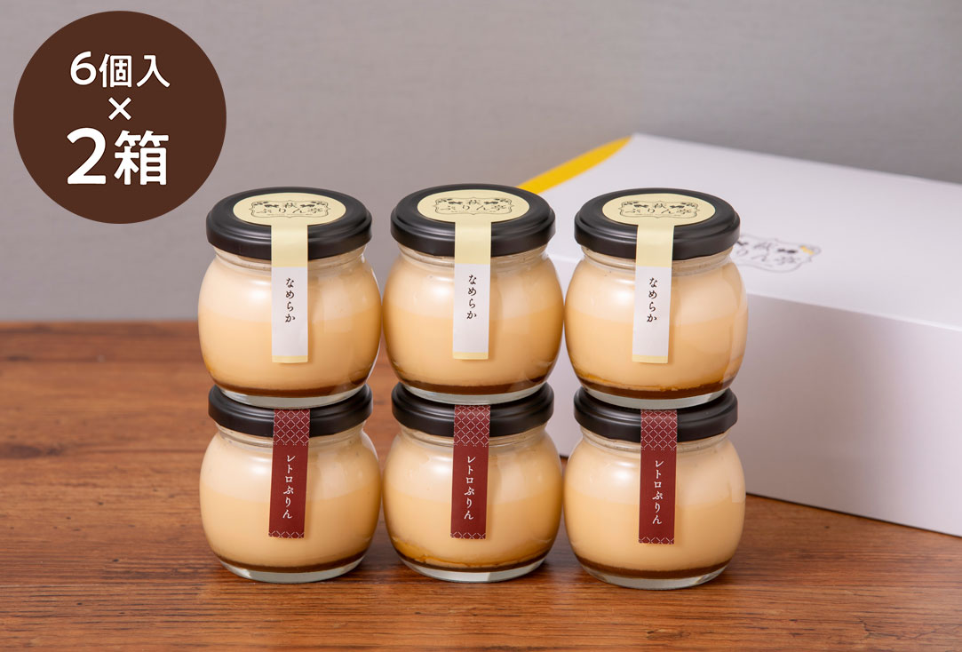 たっぷり楽しめる12個入り! 懐かしさと滑らかさが共演する「レトロぷりん」と「なめらかぷりん」の贅沢セット。 心ゆくまで味わえる幸せをお届けします。