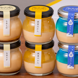 【なめらか】牛乳(国内製造)、生クリーム、卵黄(卵を含む)、グラニュー糖、天然バニラビーンズ 【渚ぷりん】牛乳(国内製造)、生クリーム、グラニュー糖、卵黄(卵を含む)、レモン果汁、天然バニラビーンズ、ゲル化剤、クチナシ色素、香料 【萩夏みかん】牛乳(国内製造)、生クリーム、グラニュー糖、卵黄(卵を含む)、夏みかん、レモン果汁、天然バニラビーンズ、ゲル化剤